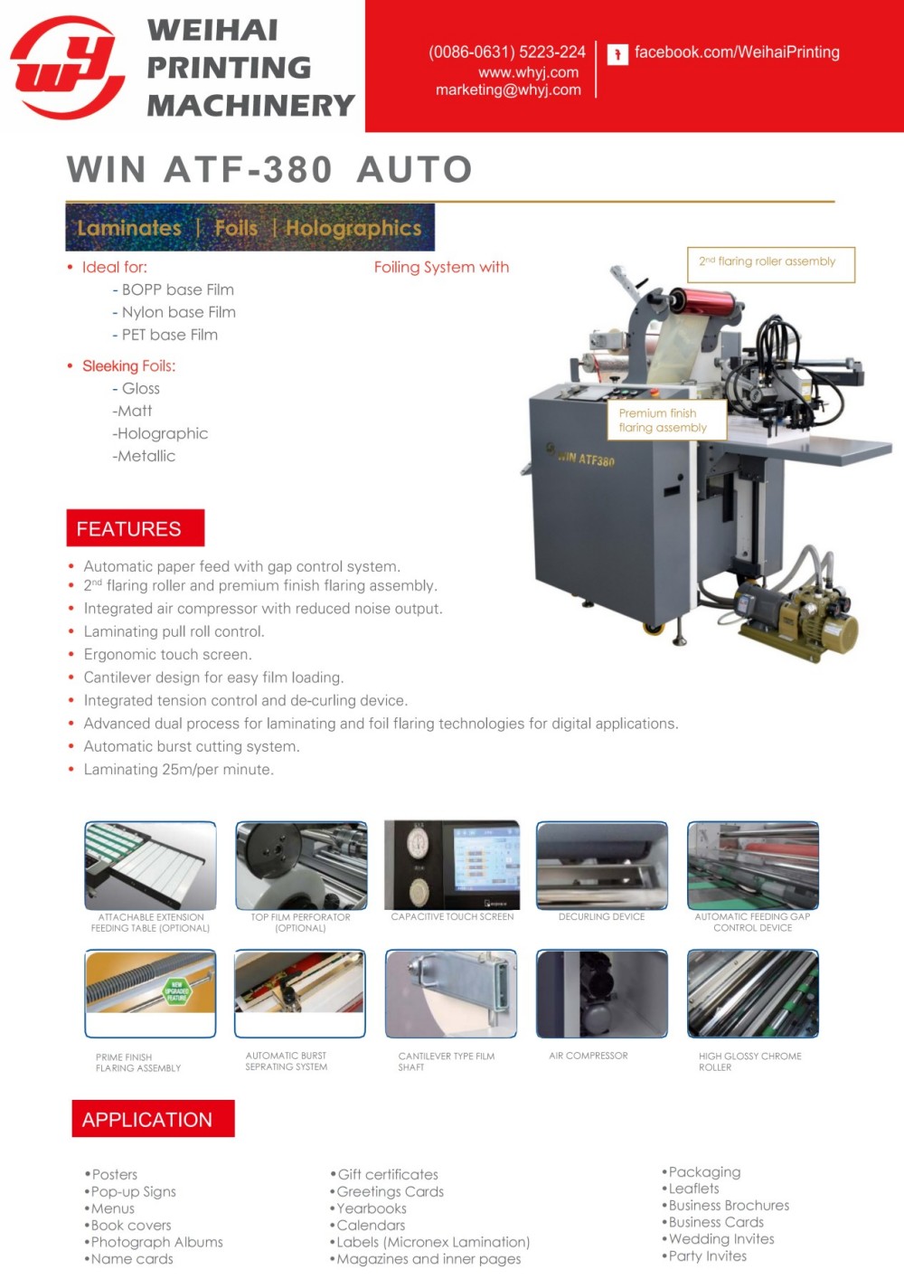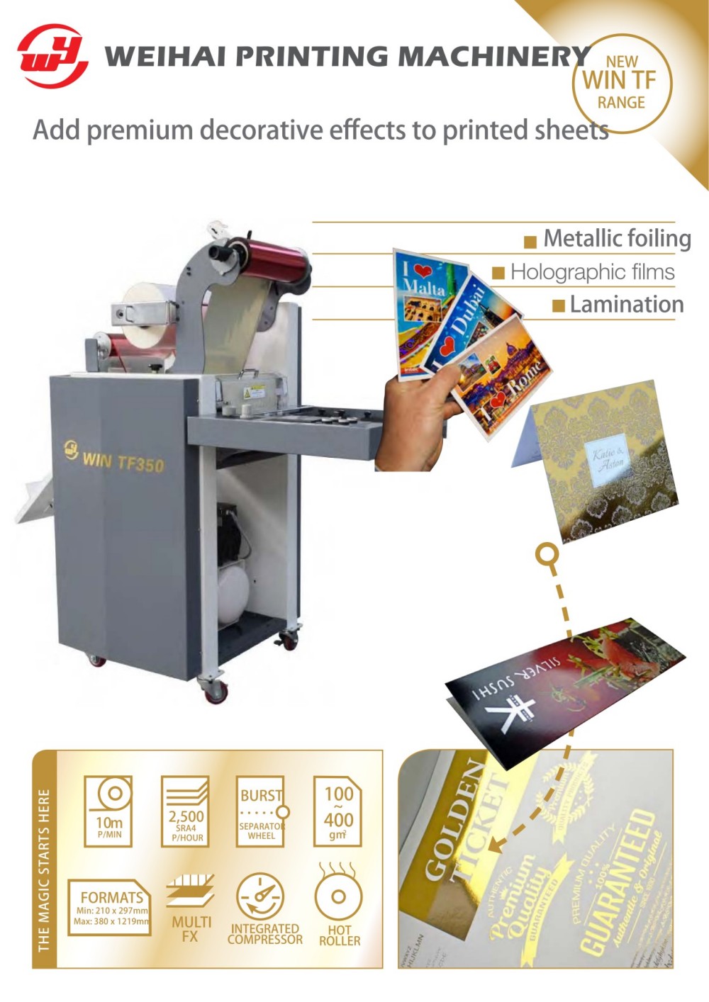 Bezplatný laminovací a fóliovací stroj navrhnutý a vyrobený spoločnosťou Weihai Printing Machinery Co., Ltd. je stroj na laminovanie a fóliovanie s ručným podávaním papiera. Jeho kompaktný dizajn šetrí miesto pri balení funkcií laminovania aj fóliovania – ideálne pre firmy, ktoré chcú pridať dekoratívne prvky vo svojom dome. Premieňa bežné tlačené materiály na vynikajúce hotové produkty, ktoré bezproblémovo fungujú s digitálnymi aplikáciami na požiadanie aj s tradičnými litografickými ofsetovými tlačmi. Aby ste dosiahli čo najlepšie výsledky, je vybavený elektronickým ovládacím zariadením, ktoré počas prevádzky upravuje tlak valca a teplotu ohrevu. Tieto úpravy sú založené na faktoroch, ako je rýchlosť chodu, hrúbka papiera a dizajnové vzory. Tento stroj sa osvedčil ako špičkový nástroj na lisovanie a laminovanie za horúca bez výroby platní, ktorý pomáha zákazníkom pridať značnú hodnotu ich produktom. Zákazníci majú na výber aj širokú škálu laminovacích fólií a kovových fólií, aby mohli splniť všetky ich dekoratívne potreby. Navyše obsahuje predĺžený stôl na podávanie papiera, ktorý je ideálny pre bannery a mimoriadne dlhé tlačené materiály.